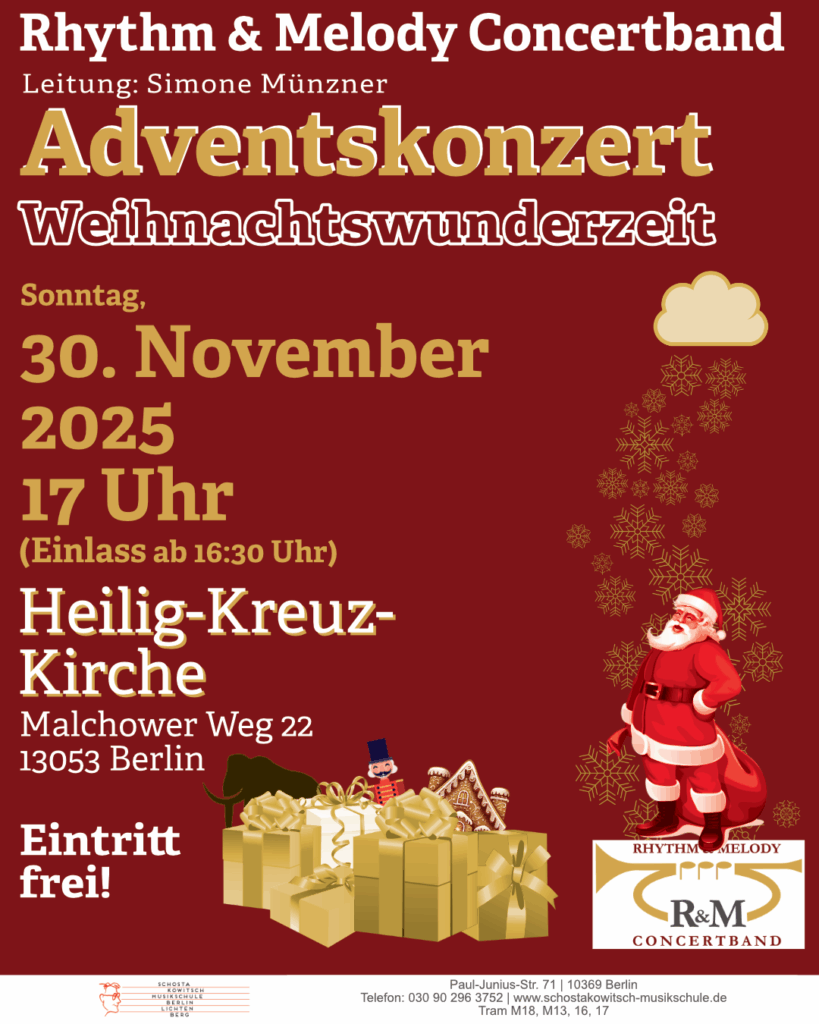 Am ersten Advent laden wir zum traditionellen Adventskonzert in die Hohenschönhausener Heilig-Kreuz-Kirche ein. Sie erwartet ein rund einstündiges Programm mit Musik für die ganze Familie – von Disney, über Originalkompositionen und lustige Arrangements bis hin zur Oper ist alles dabei.