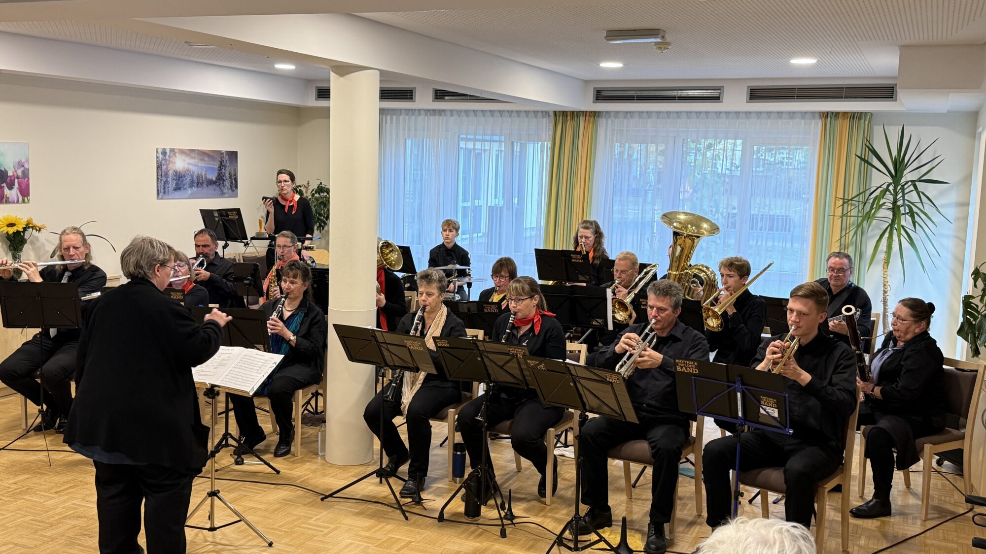 Am 02.11.2025 gab sie ein Konzert im Pflegezentrum Alpenland in Biesdorf. Schnell füllte sich die Cafeteria. Die Pflegekräfte manövrierten die Bewohner so, dass der Platz optimal ausgenutzt wurde. Die anfängliche Sorge, dass wir 20 Musiker zu laut wären, verflog rasch.